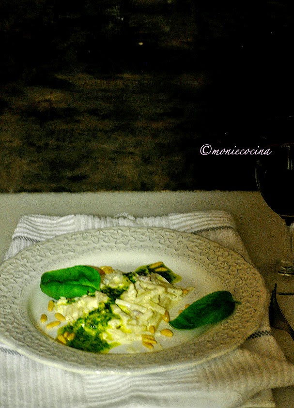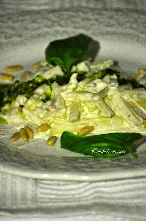 Cuando la salsa esté en el punto espeso que queramos, añadimos los tallarines de patata, mezclamos y ponemos en el plato de servir, añadimos un para de cucharadas de pesto al gusto y decoramos con unos piñones y una hojas de albahaca. Servimos rápido que ya sabéis que las salsas de crema se enfrían enseguida. Y a disfrutar, ya me contaréis.