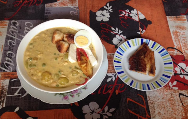 Servimos con trocitos de queso, la mitad de un huevo duro, maduro frito, ramitas de pimiento rojo y unas bolitas de harina con queso. Buen provecho!!!!
