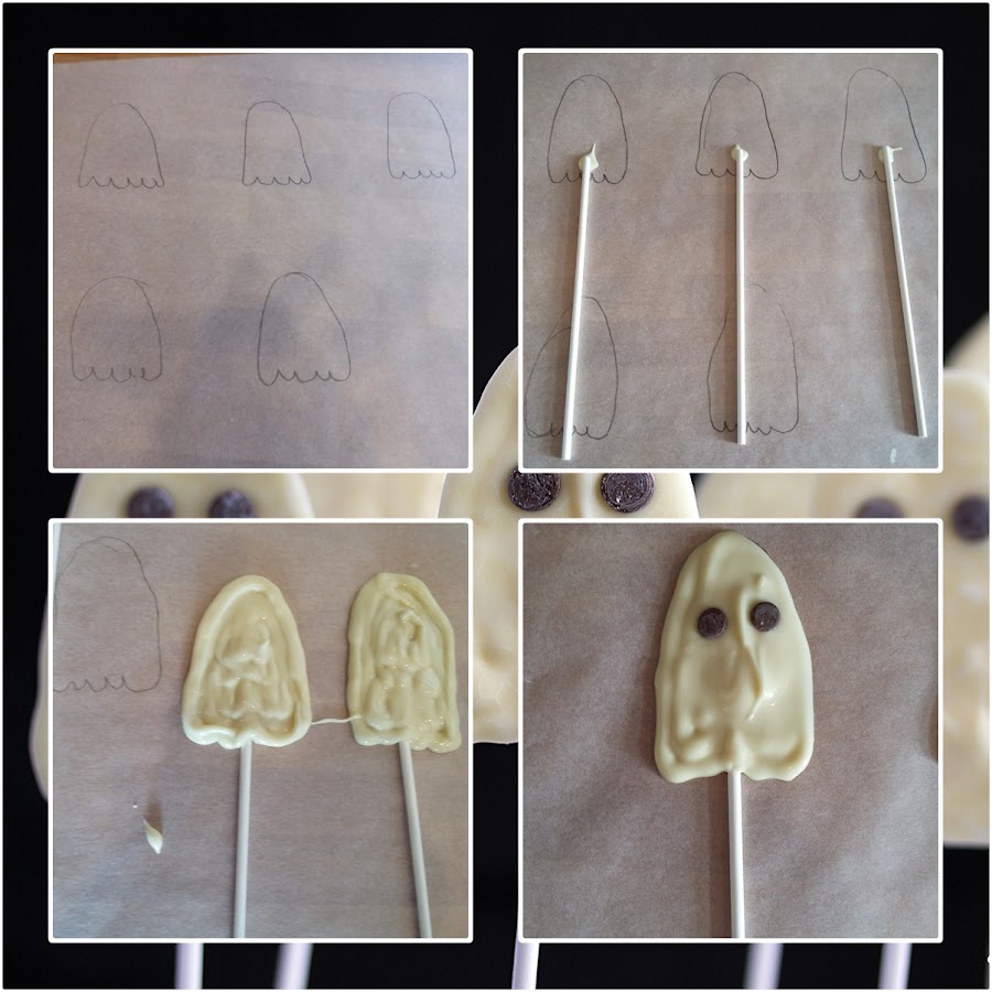 Echamos una gota de chocolate en la parte de abajo del fantasma y pegamos el palo. Dejamos enfriar un poquito.