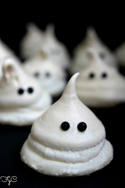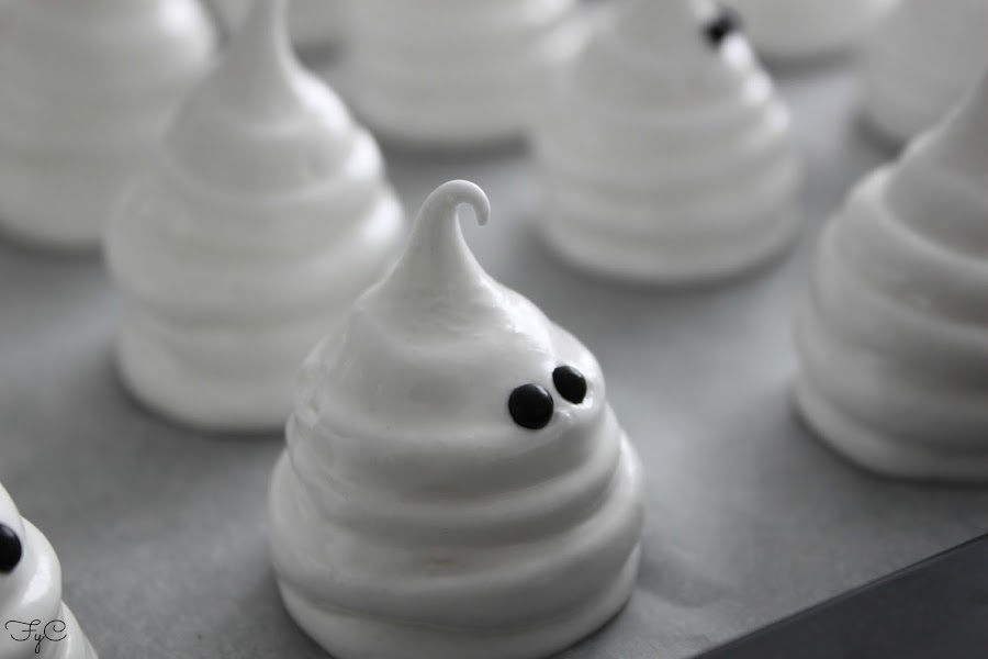 · Para que no se os ?suiciden? los fantasmitas de merengue como me pasó a mí la primera vez (durante el horneado todos se torcieron), es mejor darles una base más ancha y mantener la manga en vertical para que el merengue quede centrado.