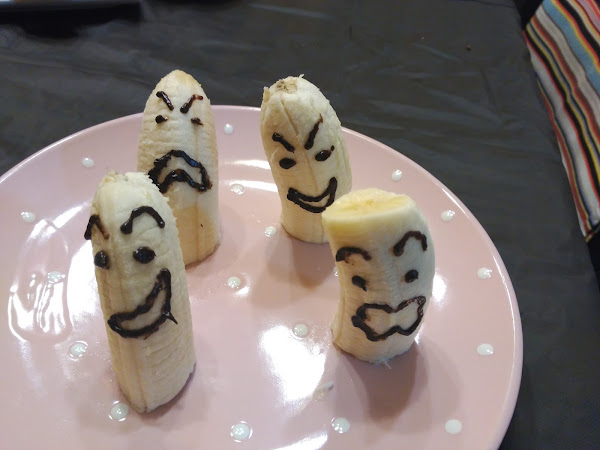 - Los fantasmátanos está clarísimoooo: Pelar y cortar los plátanos por la mitad y con el sirope, dibujarles unas caras bien divertidas.