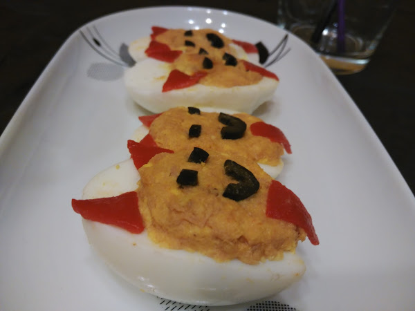 - Los huevos, les vaciáis la yema y preparáis un relleno con ellas, el atún, y el ketchup o mayonesa (o con lo que más os guste) y con los pimientos y las aceitunas, les ponéis caras a los demonietes.