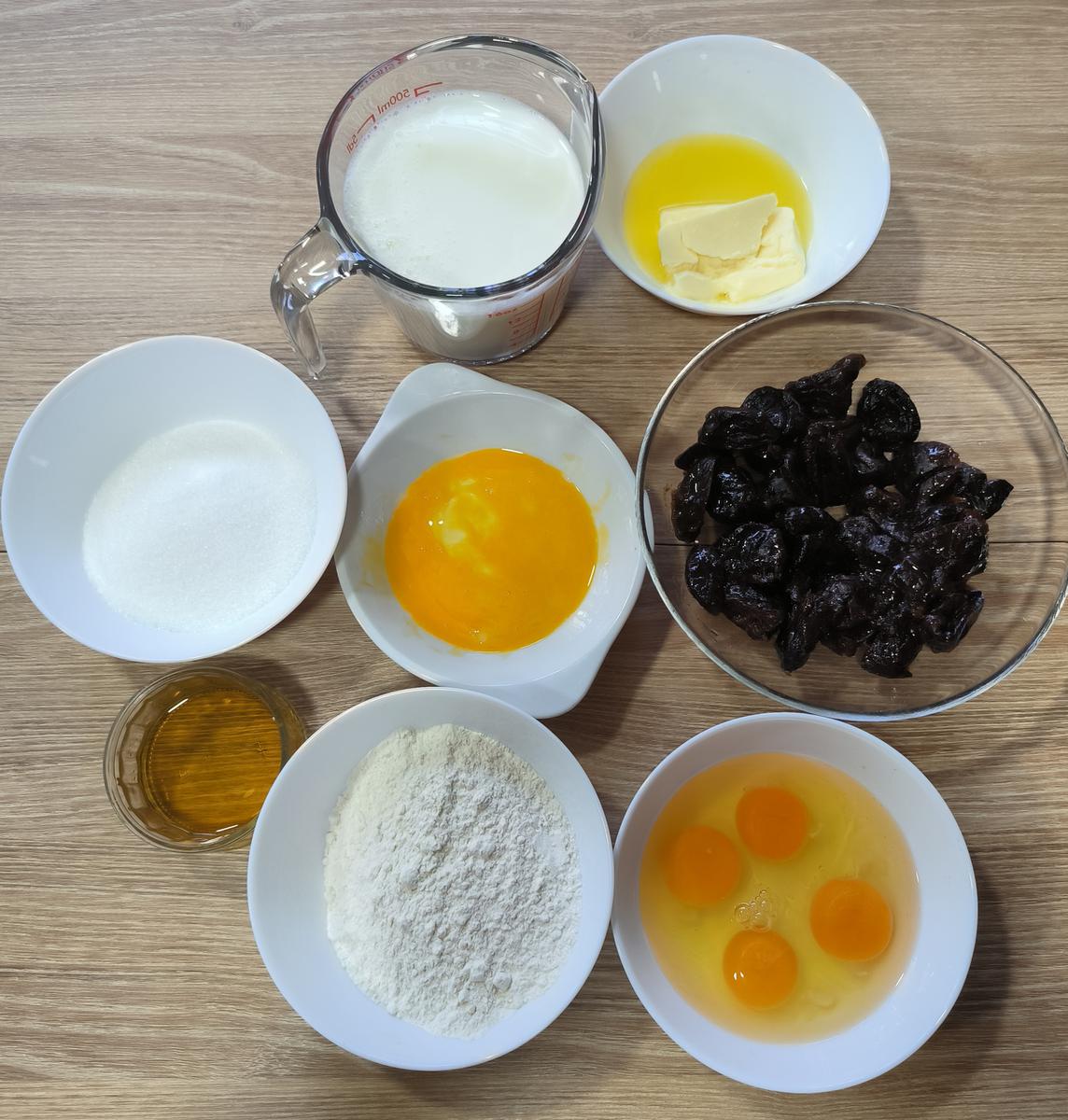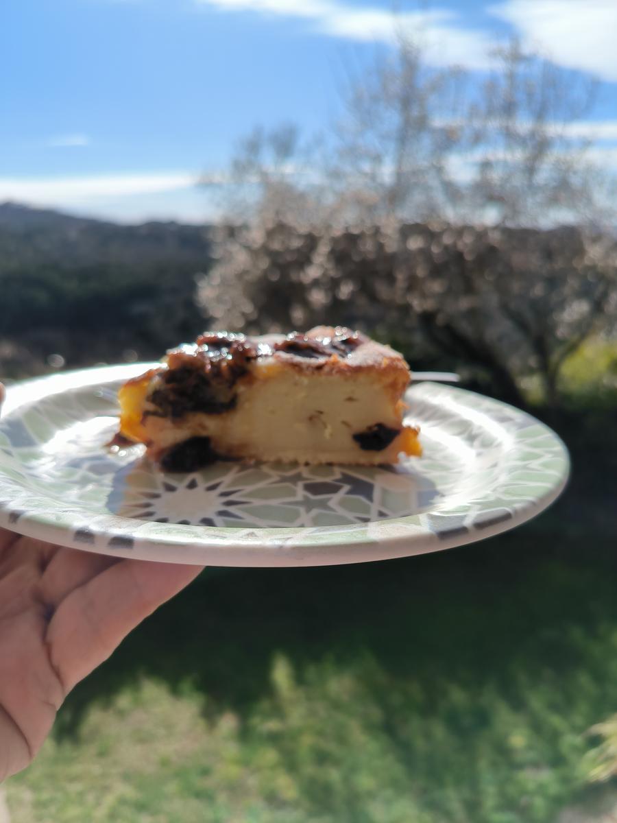 Es un postre bastante sencillo, lo único que hay que estar atento es en dejar toda la noche marinando las ciruelas pasas en brandy y ron. está muy rico, a mi también me recordó un poco al clafoutis de frutas.