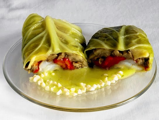 Mientras, y en una olla con agua y sal, ponemos a hervir las hojas de col hasta que estén tiernas pero enteras. Las sacamos después a una fuente, para que se enfríen y reservamos el agua de la cocción.