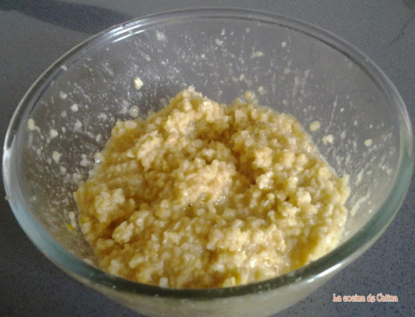 Batimos los huevos en un bol, añadimos la almendra molida, el azúcar y la ralladura de limón. Mezclamos bien y reservamos.