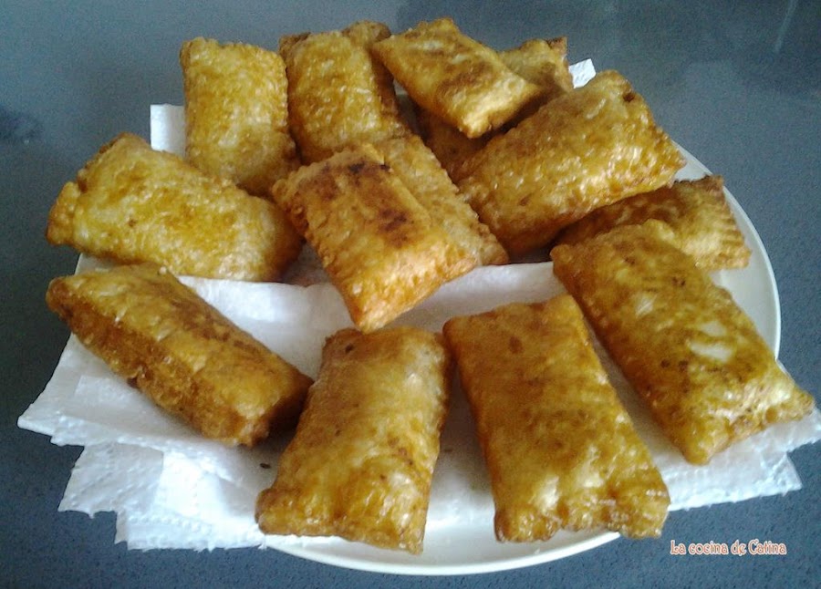 En el centro de cada rectángulo ponemos una cucharada de relleno, lo cerramos sellándolo bien con la punta de un tenedor para que el relleno no se salga.