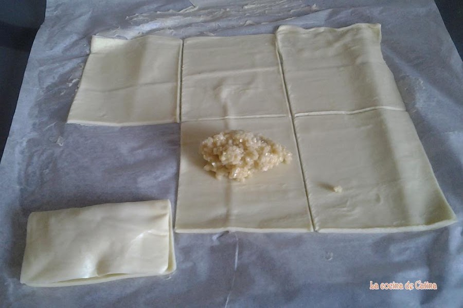 Estiramos el hojaldre con un rodillo y lo cortamos en rectángulos de 8X10 centímetros.