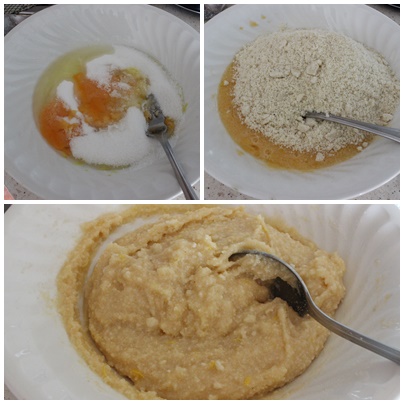 Hacemos el relleno: mezclamos la almendra molida con el azúcar y los huevos.