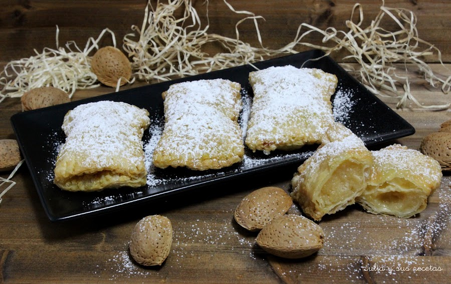 Se trata de un rico manjar de una masa hojaldrada rellena de una especie de crema de mazapán, pero mucho mas liviana. Hecha con almendra molida, huevos y azúcar, que es ideal para comer en cualquier época del año, aunque allí son típicos de Navidad.