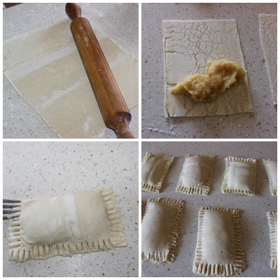 Colocamos en el centro de cada rectángulo, una cucharada de crema de almendras y cerramos los bordes presionando con la punta de un tenedor como si se tratase de empanadillas.