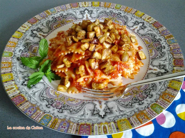 Pelar las berenjenas, cortarlas en dados y ponerlas en un escurridor con un poco de sal para que suden durante 30 minutos. Mientras tanto poner una sartén con aceite a calentar para freír la cebolla y el ajo picados, lo freímos a fuego lento durante 10 minutos, añadimos el tomate pelado y troceado, el azúcar, sal y pimienta, tapamos la sartén y dejamos cocer a fuego lento 30 minutos, removiendo de vez en cuando, hasta que se espese. Enjuagamos las berenjenas las escurrimos y secamos con papel de cocina. Ponemos a calentar la mitad del aceite en una sartén y freímos las berenjenas en tandas hasta que estén doradas. Mientras ponemos a hervir agua con un poco de sal y cocemos la pasta siguiendo las instrucciones del envase. Cuando esté cocida la escurrimos y la pasamos a una fuente de servir, cubrimos con la salsa de tomate mezclamos bien y ponemos los dados de berenjena por encima. Adornamos con una ramita de albahaca.