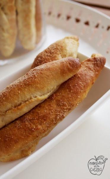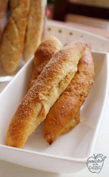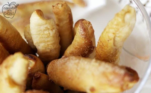 Estiramos con el rodillo cada una de las bolitas de masa y las enrollamos por la parte larga formando un churrete. Vamos depositandolos en una bandeja de horno y los dejamos reposar durante 1 hora o hasta que doblen su volumen.