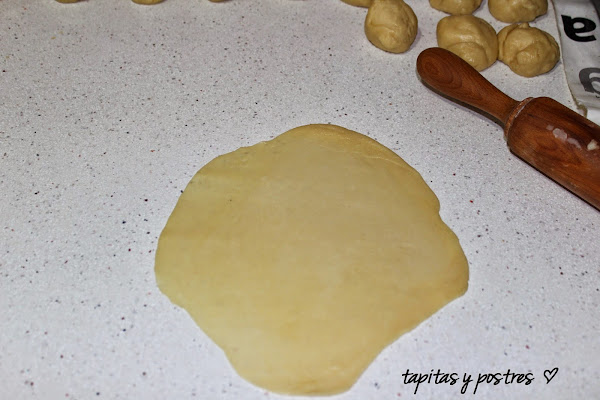 A la hora, hacemos porciones de unos 35 gramos. Dejamos unos diez minutos sobre la encimera y estiramos cada porción con el rodillo, hasta que nos quede fifnita.