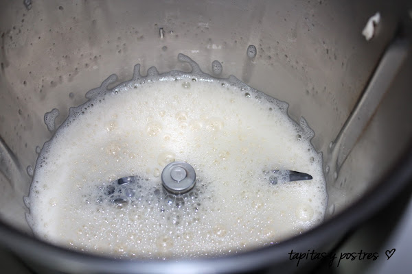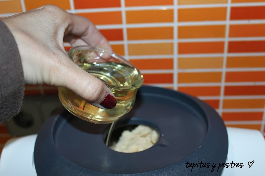 Cuando ya estén todos los ingredientes integrados, ponemos un minuto a velocidad espiga y vamos echando por el bocal el aceite poco a poco.