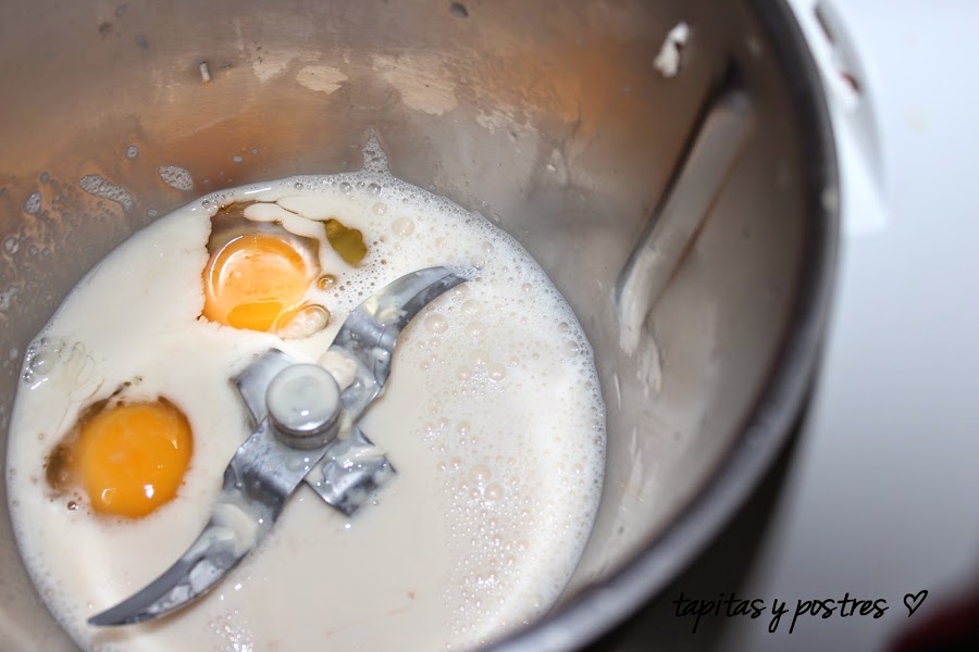 Añadimos los huevos y las dos clases de azúcar. Batimos 30 segundos a velocidad 3.