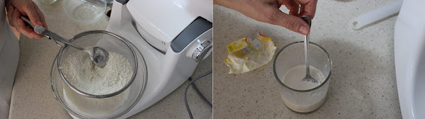 Calentamos el agua en el microondas durante 15 segundos y disolvemos los 5 g de levadura en ella.