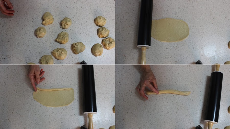Estiramos cada bolita con el rodillo, muy finita y en forma de rectángulo. Luego los enrollamos ,metemos los extremos hacia dentro y los sellamos bien...