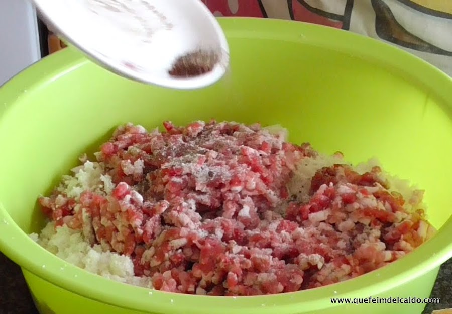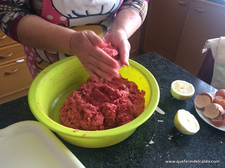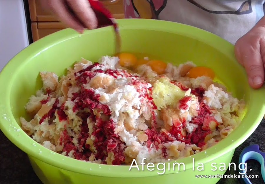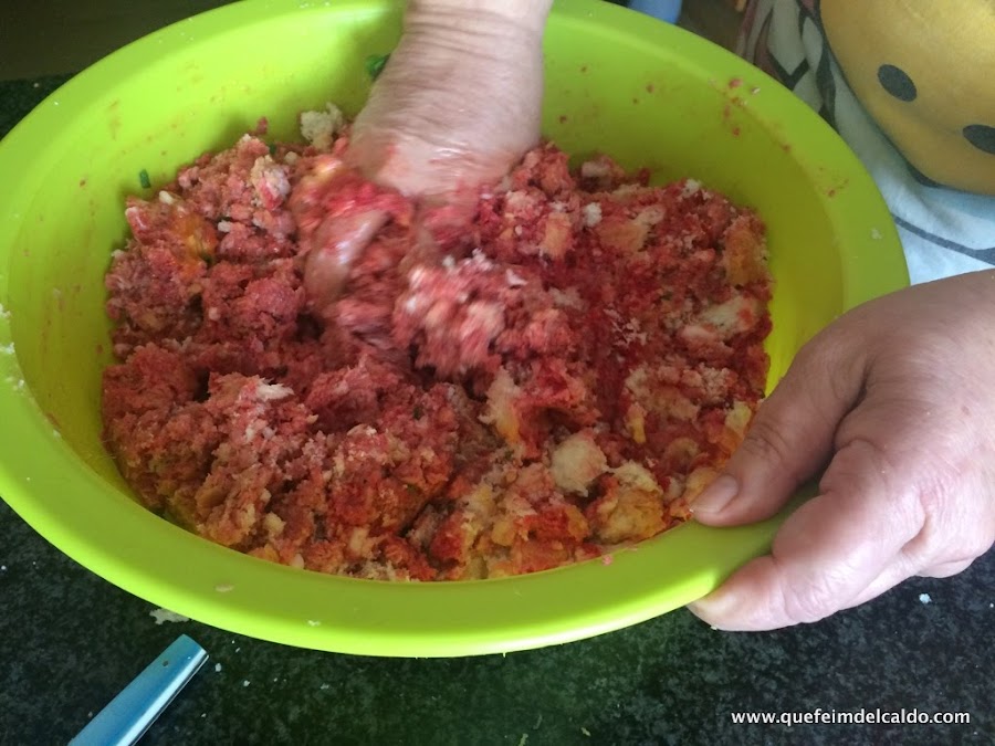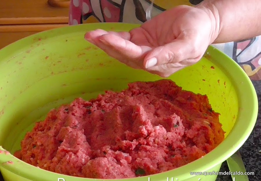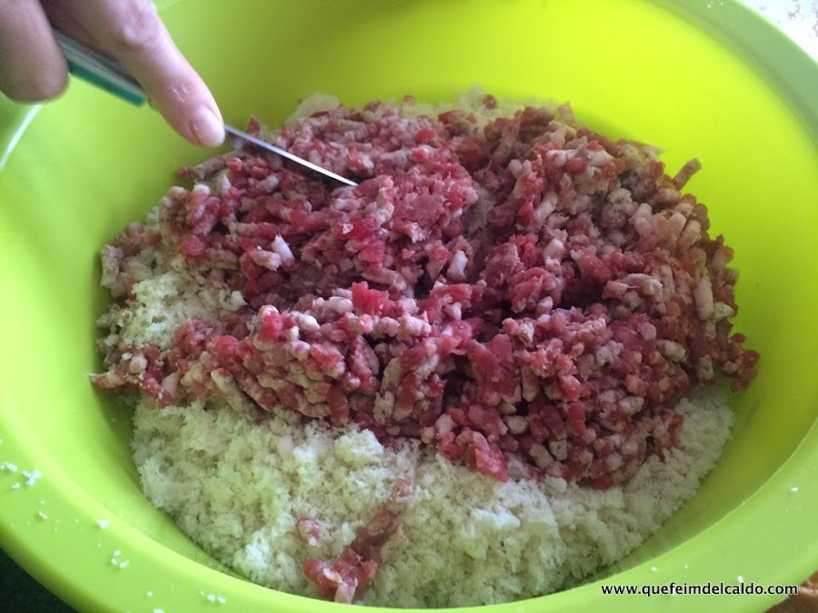 Una vez que el pan está desmigado incorporamos el 1kg de carne compuesto por magro de cerdo, blanquet, ternera y tocino de cerdo.