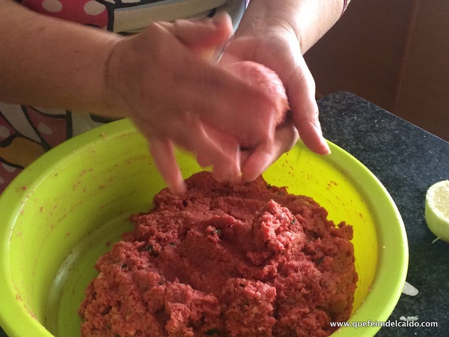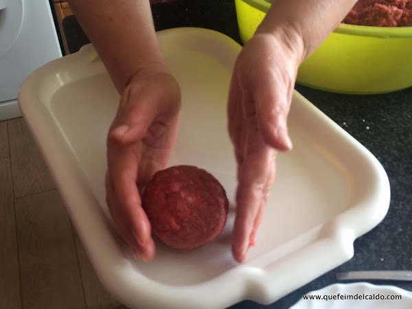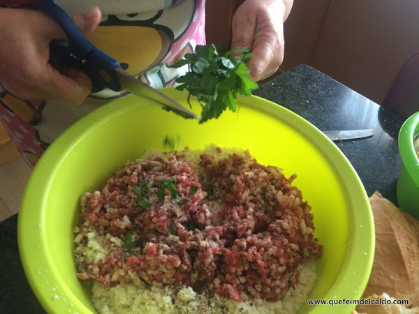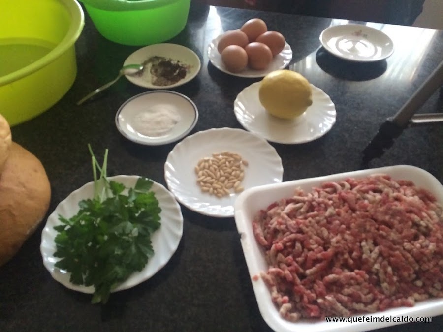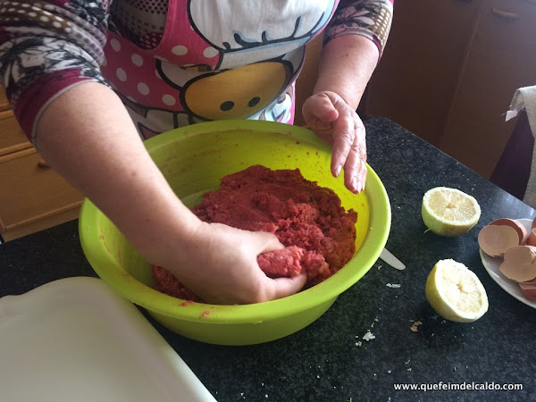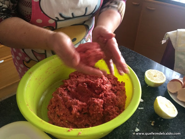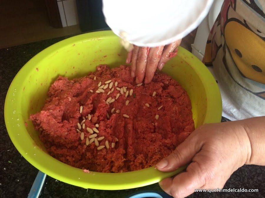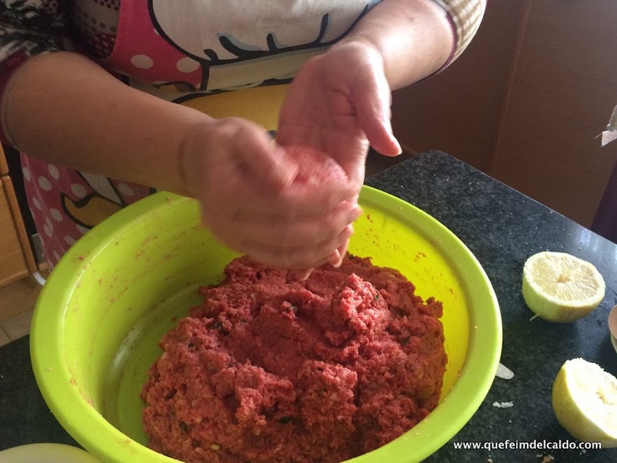 Una vez que el pan está desmigado incorporamos el 1kg de carne compuesto por magro de cerdo, blanquet, ternera y tocino de cerdo.