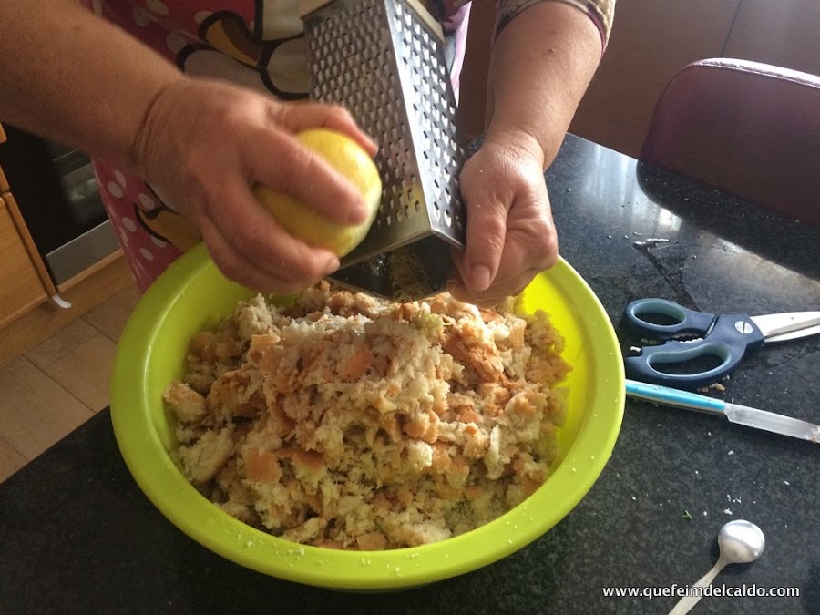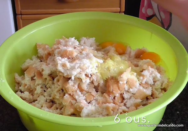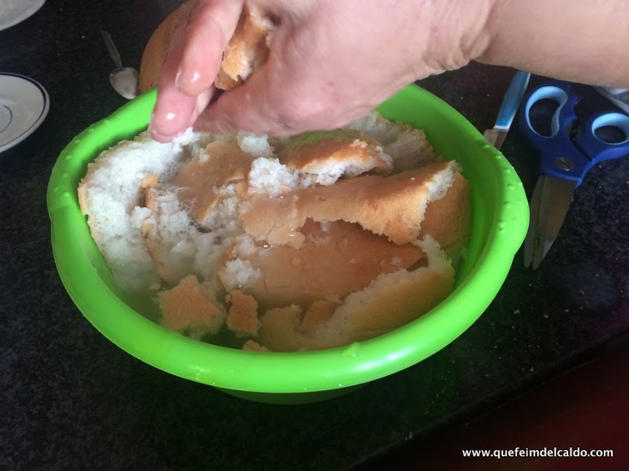 Seguidamente añadimos la corteza de pan que estaba con agua, escurrimos bien para poner la menor cantidad de agua posible.