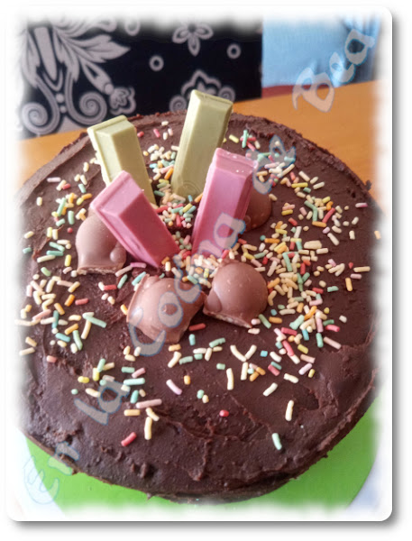 En la parte alta, clavamos trocitos de kit kat, trocitos de kinder bueno o similar, lo que queráis y acabamos con birutitas de colores-