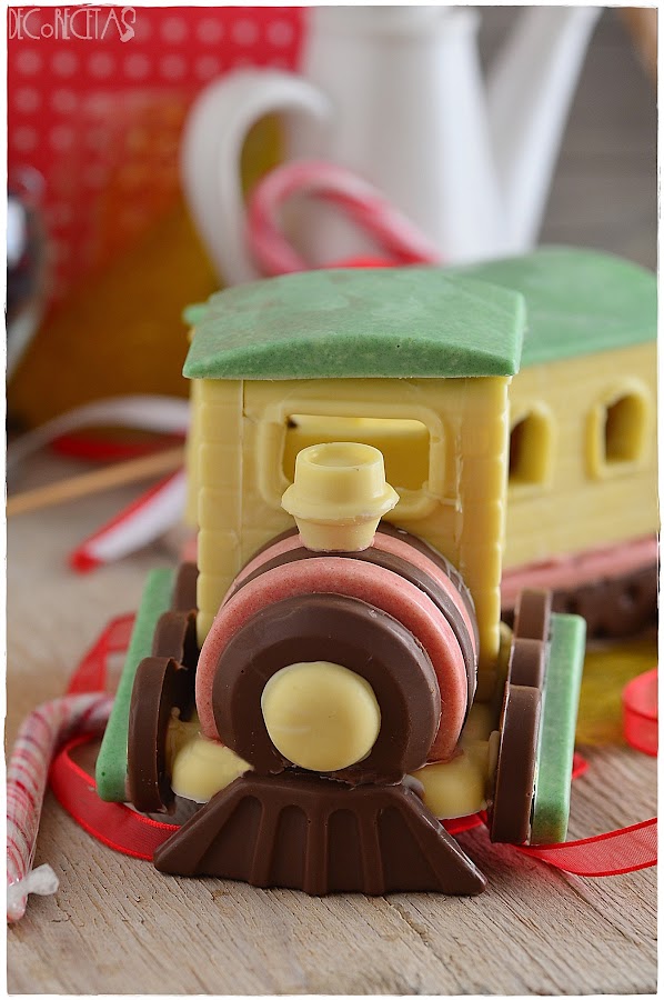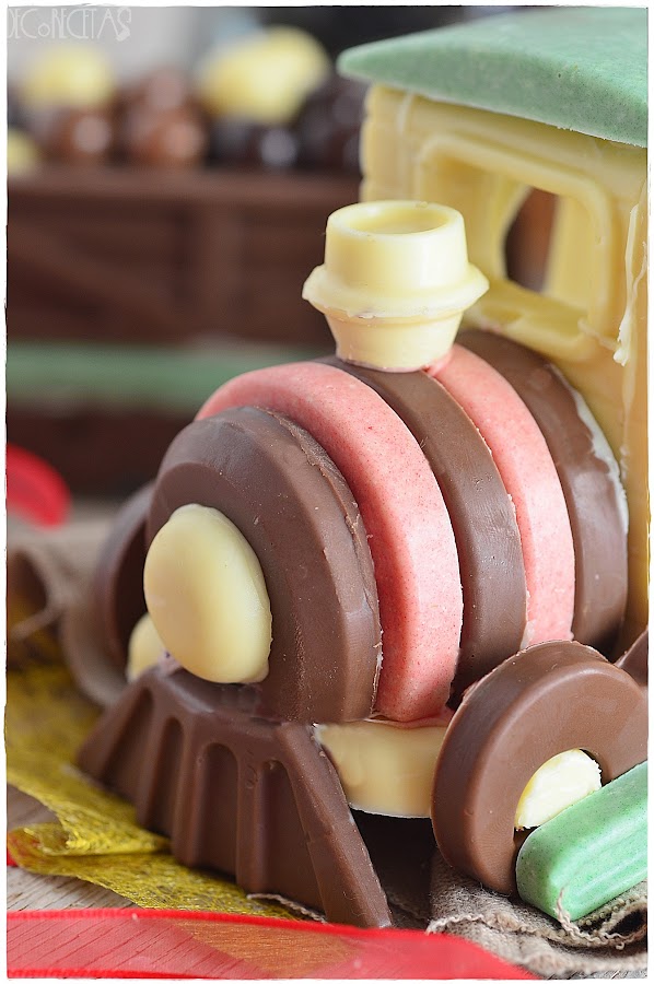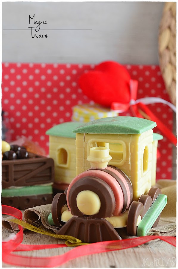 Está realizado con el molde Magic Train de Silikomart y es de chocolate en su totalidad. Me da pena comerlo y es por ello que es el centro de mi mesa durante estos días.
