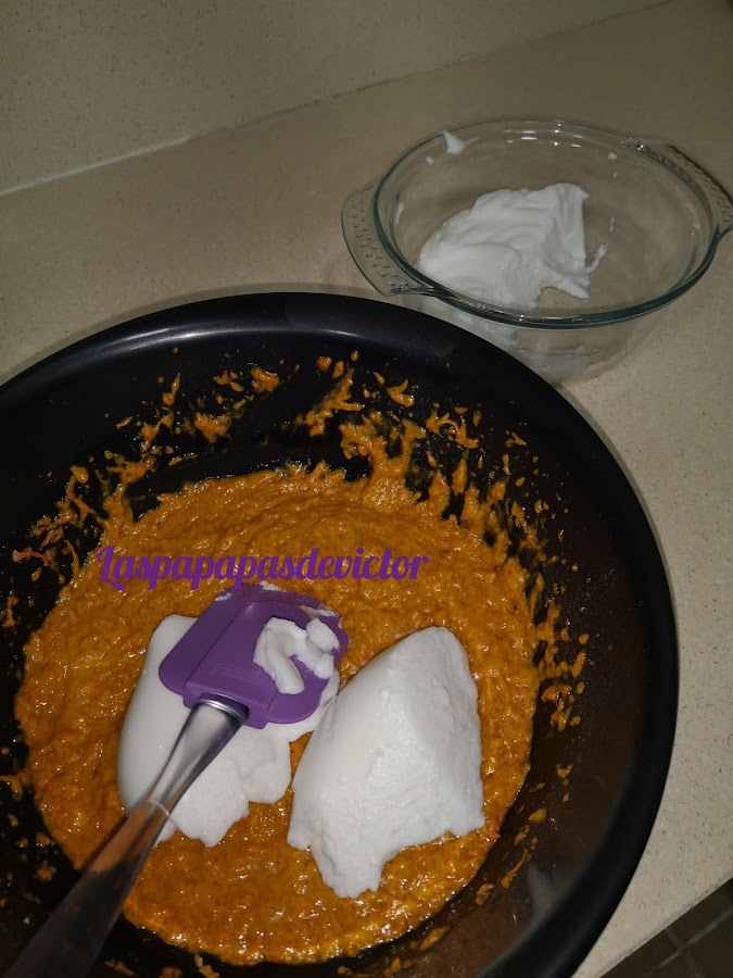 Mezlcsr con movimientos suaves las claras, ponerlos en el recipiente y hornear a 180° arriba y abajo sin ventilador 45min