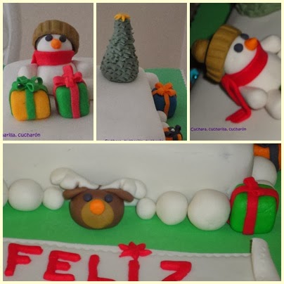 La decoración, toda en fondant, que además, al ser casi toda blanca, lo que nos ahorramos en teñir, lo tuvimos que invertir en que la cobertura quedara perfecta, porque al ser tan lisa, a los no profesionales como a mi, nos cuesta un poquito. Pero quedó muy vistosa y por supuesto, muy navideña, que era de lo que se trataba. Los muñequitos, los regalitos y el árbol de navidad, los preparé un par de días antes, para que secaran bien. Así pues, el montaje de esta tarta fue muy sencillo puesto que ya tenía toda la decoración preparada.