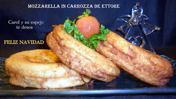 ETTORE: no podía faltar!! Que difícil me lo has puesto joío, para elegir una receta y que pueda salir medianamente honrosa, jajajaja Nada.... sin complicarme, algo sencillo y me encontré con estos bocados de queso de lo mas apetitoso, espero que te guste la versión que he hecho, como es posible que tu tomate esté impoluto en lo alto????? jajajaaj. La podéis encontrar en http://www.bavette.es/tapas-pinchos/38-mozzarella-in-carrozza/, no os podéis perder esta receta ni ninguna de sus recetas, ya se lo he dicho a él muchas veces, para mi es la ¡¡¡PERFECCIÖN!!! te quedas con la boca abierta con sus presentaciones, es fabuloso.