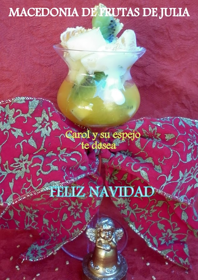 JULIA: Julia!!!!! que te adoro!!! estás casi desde el principio conmigo y nos seguimos mutuamente y eso gusta mucho!!!!! . De tu blog he elegido esta macedonia de frutas , que es de las últimas recetas que has publicado y me pareció una receta fresca, sencilla y deliciosa, que para un postre de estas fiestas GENIAL!!!!. La podéis encontrar en http://juliaysusrecetas.blogspot.com.es/2013/11/macedonia-de-frutas-con-yogurt.HTML