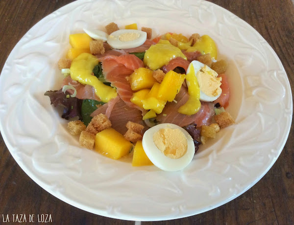 Esta ensalada de mi blog, muy sencilla solo mango, salmón, huevo duro y pan frito. Entrad en el enlace del nombre y veréis la receta entera y como se hace la salsa de mango. Muy fácil y gusta mucho.