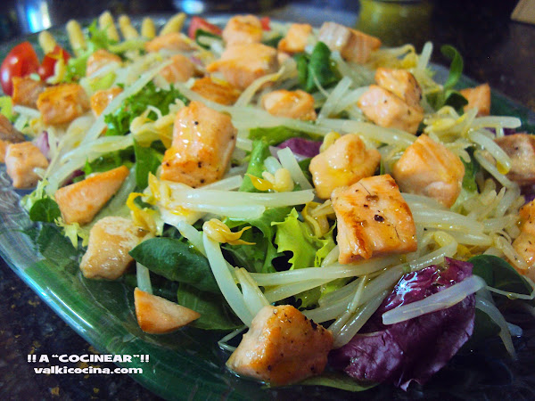 Del blog de Mariola, "A cocinear", mirad que plato tan apetitoso nos trae. Sus ingredientes principales son: Lechuga, germinados envasados, salmón, puntas de espárragos, tomates cherry y un aliño con aceite, mostaza y miel.