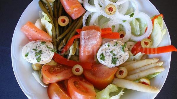 Del blog "Platos Plis Plas" es muy sencilla y algunos de sus ingredientes son de conserva como estas judías verdes tan ricas que se ven en la fotografía. Lleva espárragos, aceitunas, pimiento morrón y por supuesto el salmón ahumado. Entrad en su blog, que tiene recetas muy apetecibles.