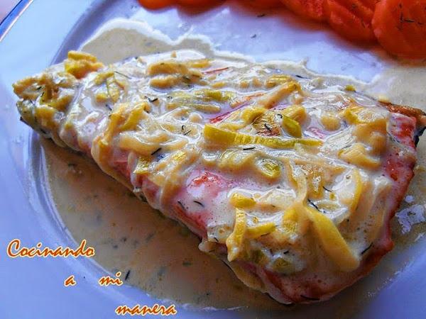 Esta receta es muy buena pues apenas tiene elaboración, es del blog "Cocinando a mi Manera". Los ingredientes también son muy sencillos, salmón fresco, 1 puerro grande, y 250 gramos de leche evaporada, eneldo y sal. Se pasa el salmón por la sartén con un poco de aceite y una vez retirado, en esa misma sartén se añade el puerro finamente cortado, se agrega la leche y poco más. Qué rico!