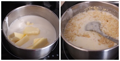 En una cazuela ponemos la nata (crema de leche) y la mantequilla y lo llevamos a fuego medio hasta que se mezclen . Añadimos el queso y lo dejamos al fuego medio hasta que se derrita y quede todo bien integrado.