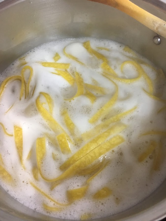 400 g de fettuccine (yo los elegí frescos, pero hay quien dice que los frescos se rompen menos al mover la pasta)