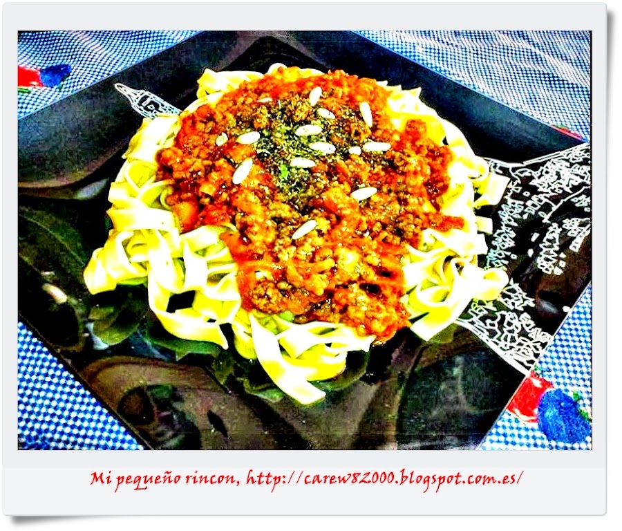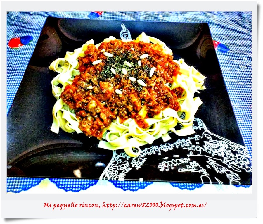Colocamos los fettuccini en el plato o bandeja y con una cuchara le ponemos por encima nuestra salsa de tomate con parmesano y carne, y ya lo tenemos listo para comer.