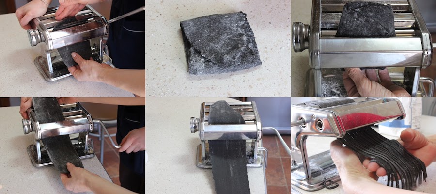 En otro bol ponemos la harina y el aceite, añadimos los huevos con la tinta de calamar y amasamos hasta conseguir una masa compacta. Hacemos una bola y la dividimos en dos partes.