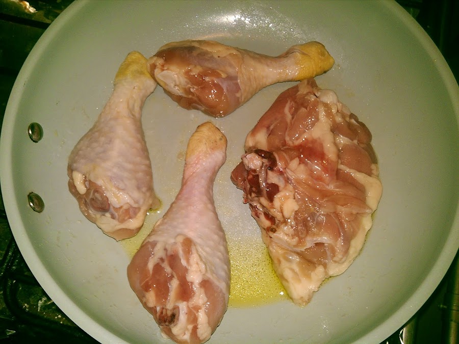 En un sarten con suficiente aceite de oliva poner a dorar los pollos hasta que en gran medida estén cocidos y luego reservar.