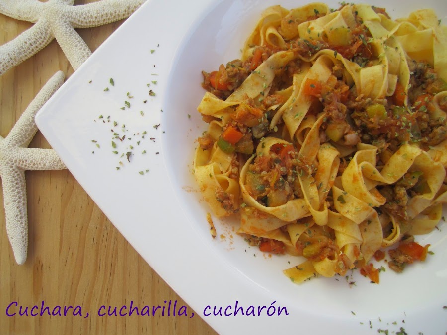Que si, que lo de la pasta con boloñesa es lo tradicional y lo que siempre "cae", pero no por eso es la única opción a la hora de tomar un plato de pasta... Pasta + pescado es una muy buena opción sobre todo para los niños (ya hemos preparado otras combinaciones: pasta con gambitas al ajillo, canelones con tomate y atún, lasaña de rape) y hoy servimos estos fetuccini (pequeñas cintas) con salsa de calamares y verduras. Riquísimos. Prepararemos una salsa con las verduras y añadiremos un picado de calamares, como si fuera carne picada (de hecho en mi casa pensaban que eran "los de siempre") para disfrutar de una combinación diferente y muy sabrosa.