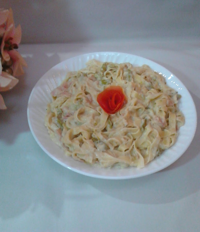 En una olla grande caliente colocar la mantequilla y cebolla dejar cristalizar,luego agregar el ajo triturado,chile dulce y apio dejar cristalizar,ya listo colocar el jamón picado cocinar 5min más,colocar la leche,crema dulce dejar calentar,una vez lista colocamos el caldo de pollo,vino blanco y el caldo de los espárragos en donde disolvemos la harina revolver a hervir y espesar ya listo agregar la sal,pimienta,azúcar y nuez moscada mezclar colocar la pasta cocinada y el queso dejar cocinar 5min más luego aparte del calor y servir de inmediato.