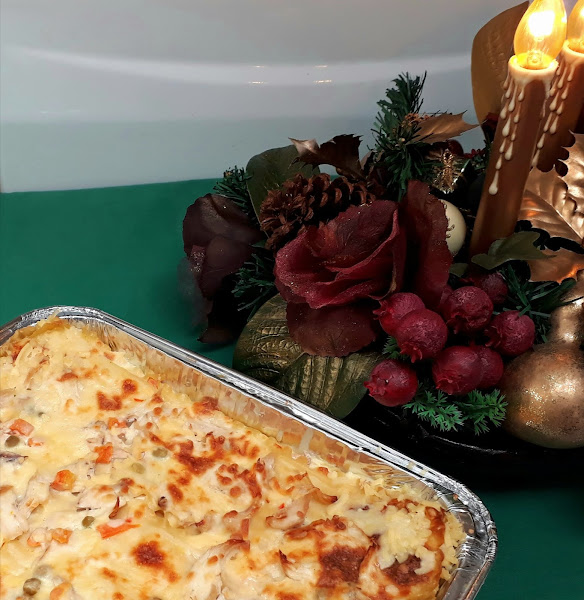 En una olla grande caliente colocar la mantequilla,cebolla cristalizar,agregar el ajo y jamón picado cocinar 3min,agregamos los hongos y dejar cocinar, ya listos colocar la harina mezclar,agregar el vino blanco,crema,leche,sazón completa,sal,pimienta y azúcar deje hervir,colocar la pasta fetuccini cocinada,tabasco y los vegetales dejar hervir 5min,aparte del calor pasar a un molde grande para horno,aparte mezclar queso mozzarella,polvo de pan y parmesano rallado rociar sobre la pasta y llevar al horno a 350grados f por 25min o al ver dorar, ya listo servir de inmediato.