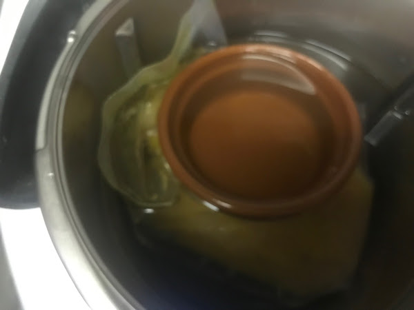 Pon el cubrecuchillas en el vaso, la bolsa de la pechuga, 1500 gramos de agua y el zumo de limón y cocina 90min/65º/vel1, si ves que la bolsa flota por un peso encima que sea resistente al calor.