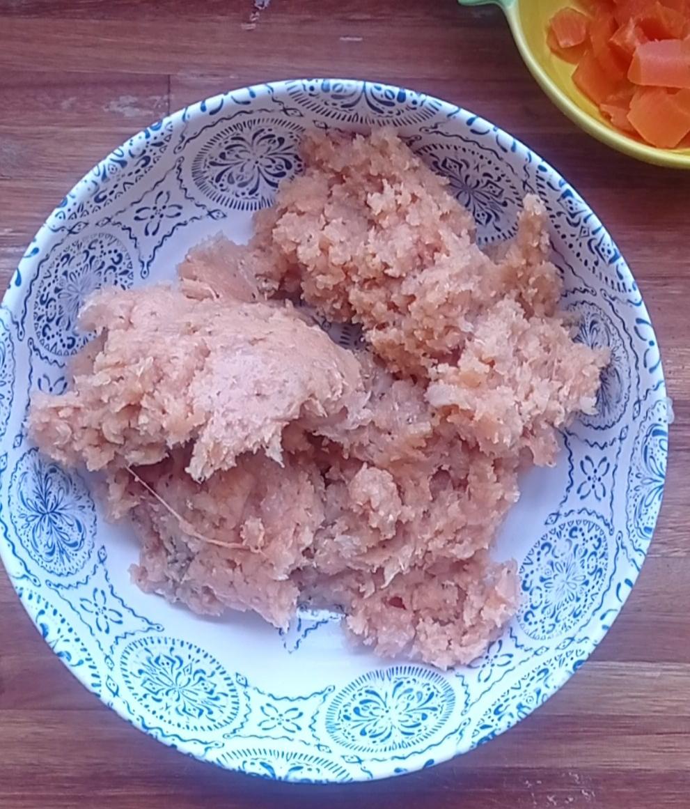 Cortar en cubos el pollo y procesarlo, si no tienes procesadora pícalo a mano y que quede muy fino .