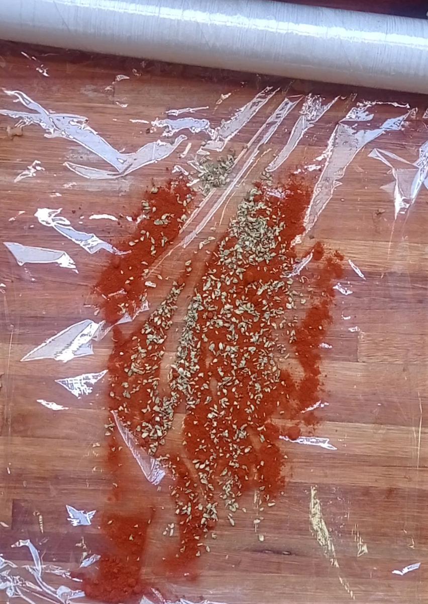Extender film sobre la mesada y espolvorear con pimentón y orégano.