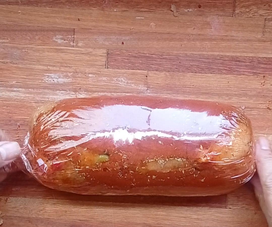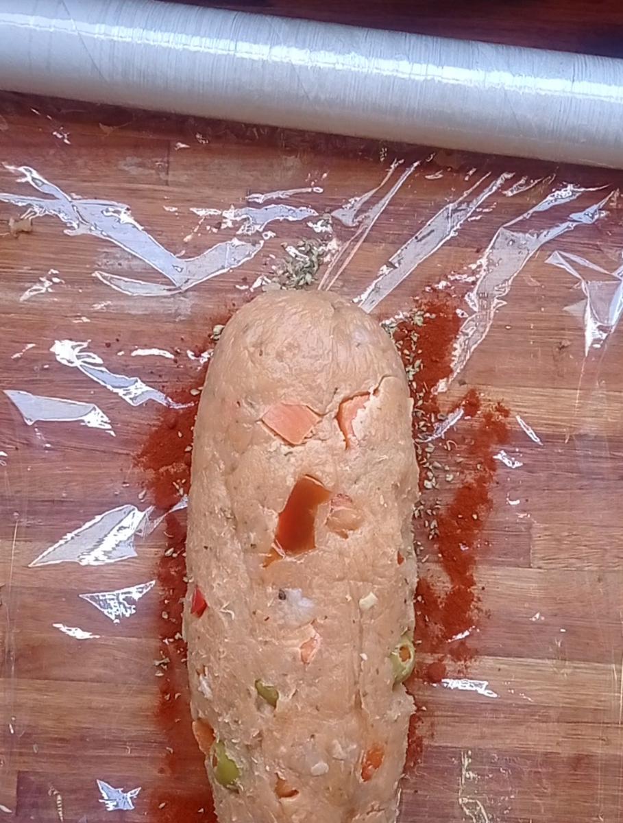 Darle forma de cilindro al pollo molido y ubicarlo sobre el film y luego cubrirlo con pimentón y orégano arriba también.