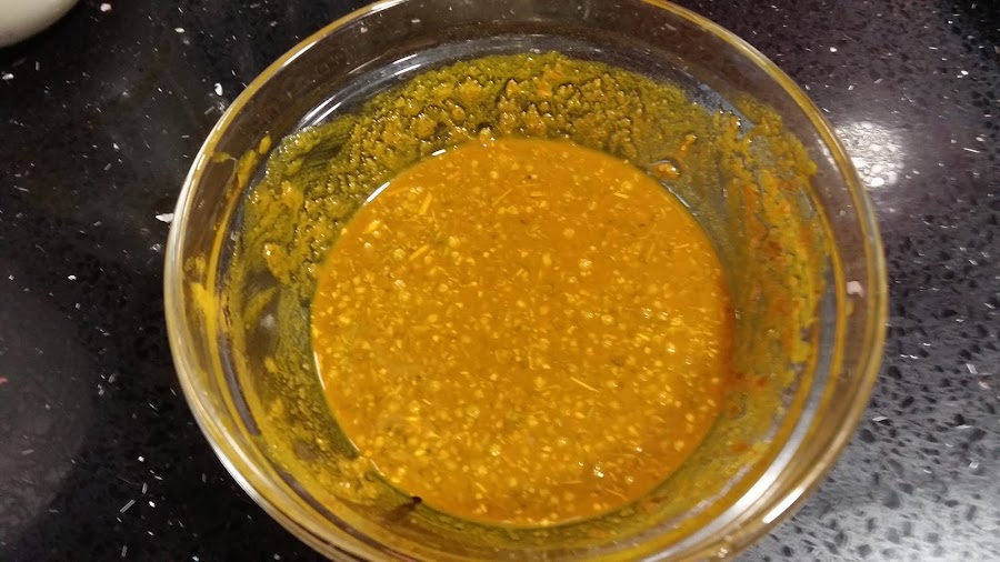 Mezclamos la cúrcuma, la sal y el orégano. Vertemos el aceite poco a poco mientras lo unimos todo hasta obtener una pasta homogénea. Reservamos.