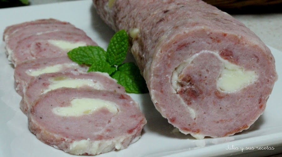 Encima ponemos las lonchetas de queso, solo en la parte central, lo enrollamos en forma de salchichón ayudándonos con el film. Lo apretamos bien y cerramos los extremos con un nudo.