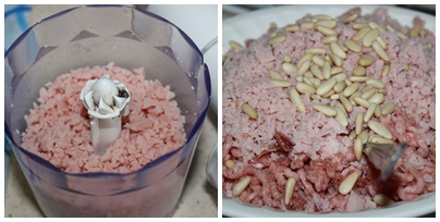 En un bol ponemos la carne cruda junto con el jamón serrano y el jamón cocido picados, le añadimos sal y pimienta al gusto , la pizca de nuez moscada y el chorrito de leche y los piñones.