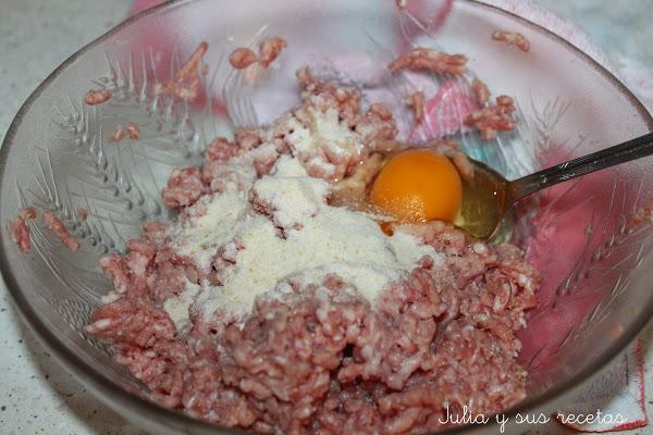 Se mezcla la carne con la sal, pimienta, ajo, huevo, vino y pan rallado.